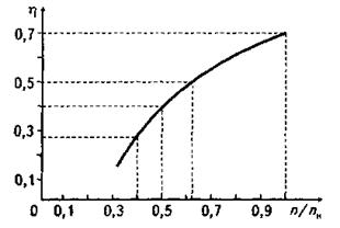 де n` = n/nн - відносна частота обертання; k - показник ступеня в механічній характеристиці насоса. При k = 2...5 максимальне значення втрат потужності ковзання становить 8...15% Pном насосного агрегату. Цим втратам відповідає частота обертання 65...80% nном. При цьому втрати потужності ковзання відносно невеликі і становлять близько 4...8% Рном насоса, що визначає (при простоті таких систем ЕП) досить широке їх використання в практиці. Крім втрат енергії ковзання Wковз, у системах ЕП є втрати на вентиляцію, тертя в підшипниках тощо, які становлять 1...3% Рн. Отже, загальні втрати електричної енергії W