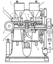 Рис. 12.14.. Схема виготовлення багатошарових таблеток Рис. 12.12. Схема накладення оболонки шляхом пресування У позиції 1 матриця наповнюється гранулятом для нижньої частини оболонки. У позиції 2 туди поміщається таблетка. У позиції 3 рухом верхнього пуансона таблетка вдавлюється в гранулят (попереднє пресування). У позиції 4 замість пуансона, що пішов вгору, підходить завантажувальна воронка з гранулятом для утворення верхнього шару оболонки. У позиції 5 відбувається остаточне пресування, після чого у позиції 6 нижній пуансон викидає таблетку, поміщену в оболонку, на поверхню столешниці. Для нанесення пресованого покриття запропоновано декілька конструкцій машин. Усі вони складаються з двох машин таблеток ротаційного типу. У одній з них робляться самі таблетки, в іншій - накладення оболонки. Одна з таких машин, вірніше агрегат, «Drycota» («Драйкота») виробництва англійської фірми «Манести» показана на Рис. 13.. На машині ліворуч відбувається таблетування, для чого гранулят насипають у бункер, звідки він передається в матриці, що знаходяться в роторі 2. Пресування відбувається за допомогою пуансонів 3 і роликів 4. Масу таблетки регулюють гвинтом 5. У машині справа відбувається накладення оболонки. З цією метою масу для оболонки насипають у бункер 6, звідки вона поступає в матриці (нижня засипка). В цей час з лівої машини за допомогою передавача 7 і 8 отримана таблетка опускається в матрицю. Потім слідують верхня засипка і пресування. Готові таблетки зсипаються в ємність 9.