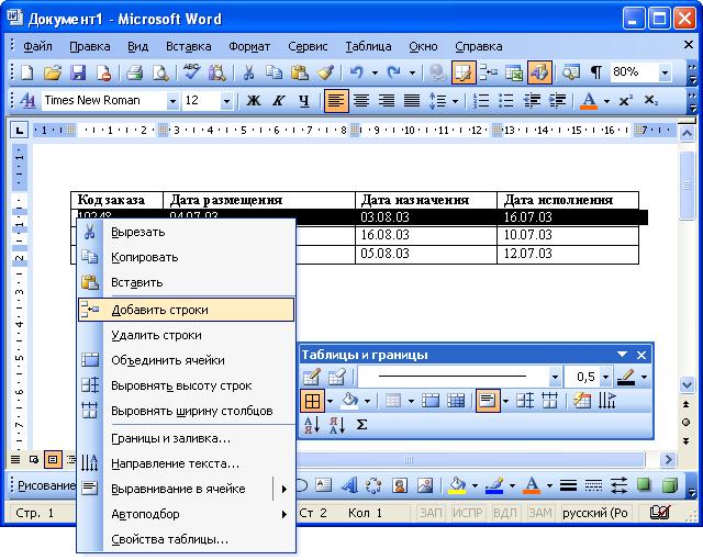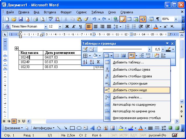 Для добавления строк в произвольном месте таблицы достаточно поставить курсор в любую ячейку строки, щелкнуть по стрелке в правой части кнопки Вставить таблицу панели инструментов Таблицы и границы (рис. 12.10) и в появившемся меню выбрать команду Добавить строки выше или Добавить строки ниже.