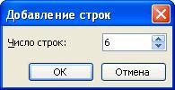 Если же требуется добавить сразу несколько строк, то можно выделить несколько строк или хотя бы несколько ячеек нескольких строк, а затем щелкнуть по стрелке в правой части кнопки Вставить таблицу панели инструментов Таблицы и границы (рис. 12.10) и в появившемся меню выбрать команду Добавить строки выше или Добавить строки ниже. Для добавления строк снизу таблицы достаточно поставить курсор под таблицу и нажать кнопку Добавить строки панели инструментов Стандартная. В диалоговом окне Добавление строк (рис. 12.11) в счетчике следует указать число добавляемых строк и нажать кнопку ОК.