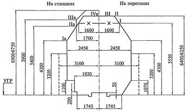 Габаритные расстояния по высоте измеряют от уровня верха головки рельса, горизонтальные расстояния — от оси пути. Очертание I—II—III установлено для перегонов и путей на станциях (в пределах искусственных сооружений), на которых не предусматривается стоянка подвижного состава, очертание Ia — IIa — IIIa — IVa — для остальных путей станций. Ширина габарита приближения строений С составляет 4900 мм.