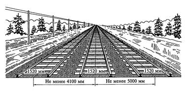 Расстояние между осями второго и третьего путей 5000 мм позволяет оставить в междупутье инвентарь и инструмент для ремонта пути при следовании поездов по этим путям. Между осями путей, предназначенных для непосредственной перегрузки грузов из вагонов в вагон, может быть допущено расстояние 3600 мм.