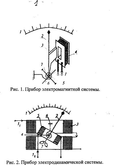 Принцип действия приборов электромагнитной системы основан на механизме втягивания подвижного ферромагнитного сердечника внутрь неподвижной катушки под действием ее магнитного поля, создаваемого в катушке проходящим через нее измеряемым током. Наиболее широко распространены электромагнитные приборы с плоской катушкой (рис. 1). Прибор состоит из прямоугольной неподвижной катушки 4, через которую проходит измеряемый ток. Катушка имеет узкую щель, в которую может входить сердечник, выполненный в виде тонкого лепестка 3 из магнитомягкой стали и закрепленной эксцентрично на оси 7 прибора. К этой же оси прикреплены указательная стрелка 2, спиральная пружина 5 и балансировочные грузы 6 и (или) может крепиться поршень воздушного успокоителя. Концы оси прибора удерживаются в подшипниках. Ток I, проходя через витки катушки, создает магнитный поток, который, намагничивая стальной сердечник, втягивает его в катушку, причем тем сильнее, чем больше магнитная индукция поля катушки. При втягивании стального сердечника ось прибора отклоняется и стрелка отклоняется на некоторый угол α. Электрическая сила, действующая на стальной сердечник и вызывающая его перемещение, может быть выражена через соответствующее этому перемещению изменение энергии магнитного поля: