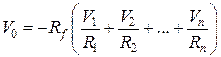 Инвертирующий усилитель может суммировать несколько входных напряжений. Каждый вход сумматора соединяется с инвертирующим входом ОУ через взвешивающий резистор. Инвертирующий вход называется суммирующим узлом, поскольку здесь суммируются все входные токи и ток обратной связи. Базовая принципиальная схема суммирующего усилителя представлена на рис. 5.8.