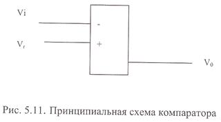 Компаратор - это электронная схема, которая сравнивает два входных напряжения и вырабатывает выходной сигнал, зависящий от состояния входов. Базовая принципиальная схема компаратора показана на рис. 5.11.