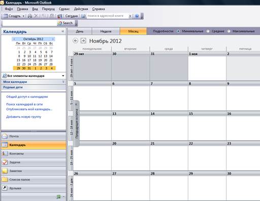 Элементы и папки Адресные книги OutLook использует несколько источников информации об адресах для личных и деловых связей пользователя. Главный источник этой информации – список контактов, на основе которого OutLook формирует адресную книгу. Информация из адресных книг используется для набора телефонных номеров, пересылки факсов и сообщений электронной почты путём выбора соответствующего номера или адреса из книги. OutLook хранит элементы информации в папках на жёстком диске. При запуске OutLook пользователь имеет доступ к нескольким папкам: · Входящие (хранилище для поступающих факсов и сообщений электронной почты; · Календарь (для планирования расписания (встреч)); · Контакты (для хранения информации о деловых и личных контактах); · Задачи (личный список дел и управление задачами, назначенными другим пользователям); · Дневник (ежедневные записи о личной деятельности, большинство из которых OutLook создаёт автоматически); · Заметки (для создания различных примечаний); · Отправленные (хранилище для элементов, отправленных по факсу или электронной почте). Календарь OutLook используется для работы с информацией, относящейся к определённым датам. Используя Календарь, пользователь составляет расписание предстоящей деятельности. OutLook позволяет вносить в расписание встречи, собрания, события. Встреча – это запланированное на определённое время мероприятие, полностью занимающее какую-то часть времени пользователя. Встреча может относиться только к данному пользователю, а может относиться и к некоторым другим людям, однако встреча не согласована с этими людьми через средства OutLook. Собрание похоже на встречу тем, что оно назначено на определённую дату и займёт определённое время. Отличие от встречи состоит в том, что собрание согласовано с другими участниками средствами OutLook. При планировании собрания OutLook находит время. Когда все предполагаемые участники свободны. Также можно согласовывать свободные ресурсы – например, помещение для собрания, проектор и т.п. Событие – мероприятие, происходящее в определённый день (или в течение нескольких дней), но не требуется резервирования времени для своего проведения. Пример события – дни рождения, праздники, выставки. Например, нужно отметить в Календаре день рождения сослуживца. Это событие, т.к. день рождения сам по себе не занимает определённого времени. Если же в честь дня рождения устраивается приём, то это встреча, т.к. приём займёт определённое время. Календарь имеет 3 варианта представления: День, Неделя, Месяц.