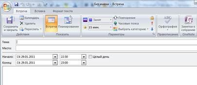На вкладке Встреча первые два поля предназначены для ввода краткого описания темы и места проведения мероприятия. Для каждой встречи время начала и окончания являются обязательными параметрами. Не следует устанавливать флажок Целый день, даже если необходимо зарезервировать весь день для какого либо мероприятия. Установка этого флажка превращает встречу в событие и, следовательно, встреча не может быть отражена в Календаре должным образом. Чтобы зарезервировать под встречу целый день, установите время начала встречи равным времени начала рабочего дня, а время конца встречи – времени окончания рабочего дня. Установка оповещения перед встречей можно выбрать из раскрывающегося списка от 0 минут до 2-х недель. По умолчанию задаётся 15 минутный интервал. OutLook позволяет по-разному отмечать интервалы времени. По умолчанию OutLook устанавливает состояние Занят на время встречи.