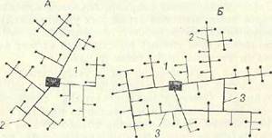 Для транспортирования тепла от источника теплоснабжения до потребителей сооружаются наружные тепловые сети. Они являются одними из наиболее трудоемких и дорогостоящих элементов системы теплоснабжения. Сети состоят из стальных труб, соединенных сваркой, тепловой изоляции, запорной арматуры, компенсаторов (тепловых удлинителей), дренажных и воздухоспускных устройств, подвижных и неподвижных опор. В комплекс строительных конструкций входят камеры обслуживания и система подземных каналов. Тепловые сети различают по числу теплопроводов, передающих теплоноситель в одном направлении (одно-, двух-, трех- и четырехтрубные). Однотрубная магистраль применяется для подачи воды без ее возврата в котельную или ТЭЦ и пара без возврата конденсата. Такое решение возможно при использовании воды из самой тепловой сети на цели горячего водоснабжения, технологические нужды или дальнее теплоснабжение от ТЭЦ, а также при использовании термальных вод. В теплоснабжении малых населенных мест применяется двухтрубная открытая система теплоснабжения, когда тепловая сеть состоит из теплопроводов подающего и обратного. Часть воды, циркулирующей в открытой сети, разбирается абонентами для горячего водоснабжения. В водяных и паровых двухтрубных закрытых системах вода, циркулирующая в тепловых сетях, или пар используется только как теплоноситель. Соединение двухтрубной системы теплоснабжения на нужды отопления и вентиляции с однотрубной системой горячего водоснабжения приводит к трехтрубной. Если система горячего водоснабжения имеет две трубы, вторая труба является вспомогательной для создания циркуляции, устраняющей остывание воды при малом водоразборе. Тогда вся система теплоснабжения вместе с двухтрубной системой отопления называется четырехтрубной. Трехтрубные или четырехтрубные могут быть применены в тех случаях, где рациональнее выделить горячее водоснабжение на третью трубу. В системах горячего водоснабжения жилых зданий, больниц, гостиниц и т. п. желательно предусматривать циркуляцию воды. Схема тепловой сети определяется размещением ТЭЦ или поселковой котельной среди теплопотребителей. Сети выполняются радиальными тупиковыми. Для поселков сельскохозяйственных предприятий, застраиваемых двух- и трехэтажными домами, расположенными группами (рис. 1), образующими параллельные фронты застройки или замкнутые контуры, могут применяться кольцевые однотрубные тепловые сети. Кольцевые системы могут устраиваться