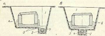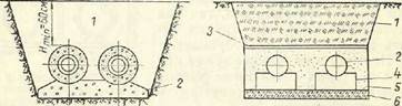 Рис. 2. размещают под каналом (рис.2), а смотровые колодцы устраивают внутри компенсаторных ниш. Устройство дренажа под каналом обходится значительно дешевле, особенно в скальных и плывунных грунтах, так как в этом случае не требуется дополнительного уширения траншей. Применение пористых бетонных труб удешевляет и ускоряет сооружение дренажа, так как уменьшаются трудоемкие работы по устройству фильтров. При сооружении канала теплотрассы в мелкозернистых песчаных и супесчаных грунтах может быть устроен песчано-гравийный или песчаный фильтр слоем 150 мм под каналом. Заглубление теплопроводов определяется, как правило, профилем земли, отметками вводов, протяженностью сети и прокладкой других подземных коммуникаций. Водопровод и газопровод обычно прокладываются на уровне теплопроводов.