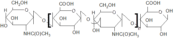 ИНУЛИН – углевод, при гидролизе которого образуется фруктоза. РАСТИТЕЛЬНЫЕ КАМЕДИ И СЛИЗИ; в их составе – гексозы, D-гексауроновые кислоты, пентозы, метилпентозы; имеют сильно разветвленное строение. 1. Гиалуроновая кислота; в ее составе две различные структурные единицы – остатки D-глюкоуроновой кислоты и N-ацетил-D-глюкозамина, соединенные между собой β (1→3) –гликозидной связью: