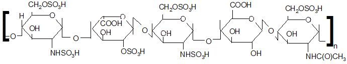 В гепарине звенья уроновой кислоты представляют собой остатки α-L-идуроновой кислоты (в виде 2-сульфата) или эпимерные по С5 остатки β-D-глюкоуроновой кислоты.