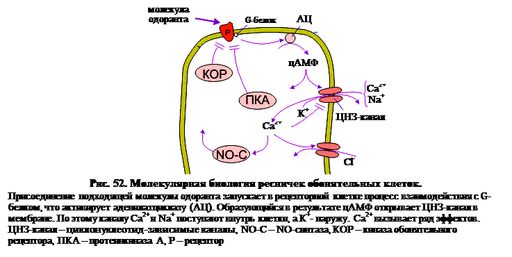 Обонятельные рецепторные белки. В последние годы идентифицировано большое семейство генов (несколько сотен, возможно, более тысячи), кодирующих обонятельные рецепторные белки, что составляет 1-2% генома. Это семейство генов кодирует семидоменные рецепторы. Семидоменные обонятельные рецепторные молекулы отличаются от прочих членов надсемейства семидоменных рецепторов большим аминокислотным разнообразием в трансмембранных доменах 3,4 и, особенно, 5. Эти домены образуют существенную часть погруженной в мембрану «бочки» семидоменного рецептора. Поскольку похоже, что Рассмотрим, как разные рецепторные молекулы приспособлены к распознаванию разных одорантов. Следует помнить, что в отличие от большинства других семидоменных рецепторных белков, сопряженных с G-белками, обладающих довольно избирательным сродством, – обонятельные рецепторные белки считаются в той или иной степени аффинными к целому ряду стереохимически сходных пахучих молекул. Есть данные, что обонятельные реснички специализированы, т.е. они способны экспрессировать только один тип обонятельных рецепторных молекул. Это однако не означает, что они реагируют только на один тип одорантов. Показано, что каждый данный рецептор стимулируется небольшим числом химически сходных молекул одорантов. С другой стороны, каждое пахучее вещество взаимодействует с некоторым числом разных рецепторов. Вероятно каждый обонятельный стимул взаимодействует со специфической группой рецепторных молекул, и этот набор рецепторов определяет индивидуальность запаха. В то же время ситуация в слизистом слое сложна и динамична; небольшим изменениям химической структуры молекулы одоранта соответствует изменение набора стимулируемых рецепторов. Изменения концентрации молекул одоранта могут влиять также на число стимулируемых рецепторов и, таким образом, изменять информацию, передаваемую в обонятельную луковицу. Параллельно меняется и субъективное восприятие запаха. Например, замещение гидроксильной группы октанола (органическое вещество, относится к классу жирных спиртов, содержится в эфирных маслах цитрусовых) на карбоксильную, казалось бы незначительное изменение, приводит к значительному изменению обонятельного восприятия запаха – вместо запаха, напоминающего апельсин и розу, появляется запах прогорклости и пота. Некоторые пахучие вещества меняют качество своего запаха при изменении концентрации. Индол, например, имеет приятный цветочный запах при большом разведении и отвратительный гнилостный – в высокой концентрации. Мембранная биохимия. Семидоменные рецепторы обонятельных ресничек связаны G-белковой системой с мембранно-связанными эффекторами. В большинстве случаев эффектором является аденилатциклаза (АЦ). Кроме того, это могут быть ФЛС-β, ИТФ и ДАГ. В тех случаях, когда вторичным мессенджером является цАМФ, он воздействует на каналы с малым диаметром поры (рис. 52). Поскольку каналы контролируются циклическими нуклеотидами, они и именуются циклонуклеотид-зависимыми (ЦНЗ-каналы). Хотя обонятельные ЦНЗ-каналы были выделены не первыми (эта честь принадлежит каналам палочек), к настоящему времени они охарактеризованы лучше других.