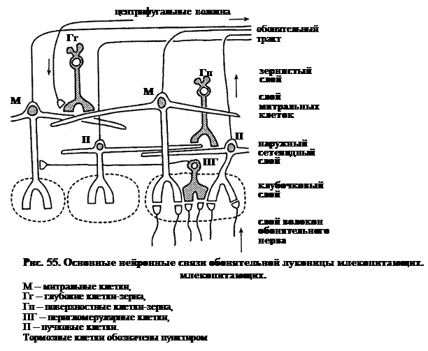 Глубже в обонятельной луковице (рис. 55) образуют слой тела митральных клеток. Между ними лежат тела клеток-зерен. Клетки-зерна лежат глубже тонкого митрального слоя и заполняют центральную часть луковицы. Зерна, как и перигломерулярные клетки, являются тормозными. Такая стратификация клеточной организации обонятельной луковицы демонстрирует сходство с сетчаткой. Основа вертикальной передачи информации – это аксоны митральных и, в меньшей степени, пучковых клеток, которые проходят два уровня горизонтальной модуляции. Детальная электронная микроскопия обонятельной луковицы показывает сложность синаптических контактов. Нейрохимия их не менее сложна. Здесь идентифицировано около 12 медиаторов, включая ацетилхолин, дофамин, γ-аминомасляную кислоту (ГАМК) и несколько нейроактивных пептидов.