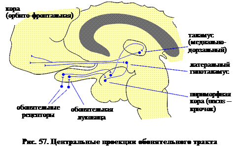 В последнее время собрано все больше подтверждений тому, что обонятельные рецепторные клети, специализированные реагировать на одни и те же запахи, проецируются в одни и те же гломерулы. Т.е., ОРК, отвечающие на небольшой класс сходных пахучих веществ или единственное вещество, могут быть распределены сравнительно беспорядочно в зонах экспрессии обонятельного эпителия, их аксоны конвергируют на небольшом числе гломерул или даже на одной (рис. 56). Более того, анатомическое расположение таких гломерул идентично у разных животных одного и того же вида. Таким образом, данный запах вызывает сходные паттерны активности в гломерулярной популяции обонятельной луковицы у всех представителей данного вида. Поскольку разные компоненты запаха активируют различные популяции ОРК, их совокупность является сложной и уникальной. Удивительно то, что запахи, как и афферентация других дистантных чувств, в центральной нервной системе могут кодироваться пространственной картиной распределения возбуждения в соответствующей проективной зоне. Из луковицы обонятельная информация передается в мозг аксонами митральных (и пучковых) клеток, образующих обонятельный тракт. Как показывает рис. 57, обонятельный тракт проходит под лобной долей и оканчивается в одной из эволюционно наиболее древних частей коры – пириформной доле (или uncus). Следующий нейрон передает обонятельную информацию в таламус, а последнее волокно передает ее в орбито-фронтальную новую кору. Помимо этого таламического пути, группа волокон проецируется через uncus в латеральный гипоталамус и отсюда в орбито-фронтальную новую кору. Возможно, именно этот путь запускает эмоциональные реакции, которые вызывают знакомые запахи и ароматы.