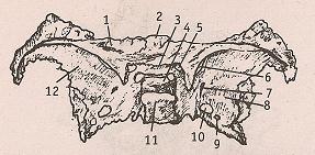 у основания каждого крыла имеются округлое, овальное и остистое отверстия, через которые проходят ветви тройничного нерва и сосуды