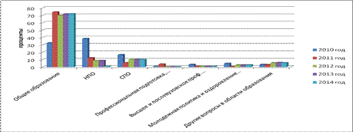 Анализ структуры расходов на образование в Оренбургской области показал, что наибольший удельный вес приходится на общее образование. Доля расходов на среднее профессиональное образование колеблется от 16,52 % в 2010 году до 10,19 % в 2014 году. Резкое сокращение удельного веса расходов по подразделу «Среднее профессиональное образование» отмечается в 2011 году.