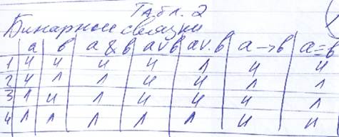 Все приведенные в таблице 2 связки являются бинарными и соединяют два суждения. Для двух суждений имеются 4 возможности: 1. Оба могут быть истинными. 2. Первое истинно, второе – ложно. 3. Первое ложно, второе истинно. 4. Оба суждения ложны.