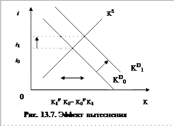 Г) Эффект вытеснения (crowding-out effect ) [8]. При осуществлении экспансивной фискальной политики (увеличение G) и неизменной монетарной политике (постоянная М) возможно проявление эффекта вытеснения. В самом деле: проведение экспансивной фискальной политики (снижение налогов и увеличение государственных расходов) приводит к сдвигу линии спроса на кредит вправо (рис. 13.7). В то же время положение линии предложения кредита (на которую влияет центральный банк) остается неизменным. Механизм эффекта вытеснения проявляется следующим образом. Сдвиг линии спроса на кредит приводит к повышению процентной ставки. И хотя общий спрос (как государственный, так и частный) на кредит возрос до положения К 1, но спрос на кредит частного сектора (К 1Р) при возросшей ставке процента снизился.