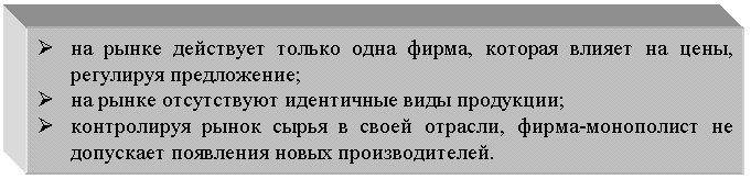 Монополия - на рынке господствует крупное предприятие-монополист, полностью контролирующее цены. Установление чрезвычайно высоких цен сдерживается угрозой падения или отсутствия покупательского спроса. Монополист оценивает спрос и устанавливает цену па уровне, обеспечивающем наибольшую рентабельность. Монополистами выступают предприятия коммунального хозяйства, без услуг которых не может обойтись ни одно предприятие, РАО ЕЭС. Существование "естественных" монополий оправдывается тем, что они наилучшим образом удовлетворяют общественные интересы. В сельской местности такими монополистами могут выступать и предприятия-поставщики сельскохозяйственной техники, химических удобрения, семеноводческие и племенные хозяйства, предприятия, оказывающие ремонтных услуги.