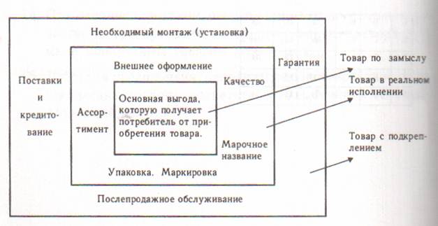 Понятие товараТовар и товарная политика Товар — любое средство, которое можно предложить на рынке для прио-бретения, использования или потребления с целью удовлетворения потребностей (физические предметы, услуги, предприятия, организации, виды деятельности, идеи). С маркетинговой точки зрения, товар — это решение для удовлетворения потребности. В маркетинге, как правило, используется трехуровневая структура товара; выбор, который делают покупатели, — это компромисс между этими тремя структурами (см. рис.).