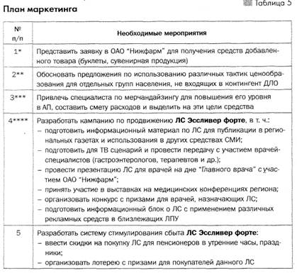 Методы контроля за выполнением ПМ зависят от тех количественных или качественных показателей деятельности АП, которые должны измениться в ходе реализации плана. Например, если стоит задача увеличить объем реализации товара ЛС Эссливер форте, то можно применить метод анализа динамики продаж с использованием темпов роста/прироста. Если стоит задача увеличить информированность врачей о данном ЛС, можно применить социологический метод опроса врачей и рассчитать коэффициент информированности По результатам контроля и анализа причин отклонений от первоначальной цели возможна корректировка ПМ. Альтернативные стратегии являются обязательным атрибутом ПМ, т к. маркетолог-аналитик быстрее всех должен понять изменения внешнего окружения и спрогнозировать возможные последствия, в т. ч. и для положения предприятия на рынке. Они позволяют в краткий период времени адаптироваться АП к новым условиям рыночной ситуации. Например, что будет делать АП, если произойдет резкое падение курса