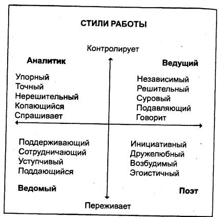 Рис.11.3 Поэт Аналитик Учет стилей работы Рис. 11.2 Отношение к переменам может быть и доброжелательным, и исключающим эти перемены. По-видимому, в условиях консультативной продажи наиболее выгодным стилем поведения будет стиль доброжелательного отношения к переменам, так как в процессе продажи под влиянием требований покупателя могут и должны значительным образом меняться параметры предлагаемого товара и отношение к этим переменам должно быть самое благожелательное. Стиль бизнеса: деловой или родственный? Конечно, только деловой стиль работы может обеспечить успешное решение трудоемких задач осуществления победной продажи на жестком конкурентном поле. Родственные отношения, кумовство могут привести к облегчению обязанностей одного из членов команды, но к проигрышу всей команды в целом. После учета культурных различий всех членов группы успеха и направления этих различий для решения общей цели - успешной продажи товара, лидер группы также должен учесть и различие стилей работы каждого члена команды. Прежде всего выделим те стили работы, которые могут значительно повлиять на общий успех команды. Различными чертами характера обладают категории людей, которых мы условно можем назвать аналитиками, поэтами, ведущими и ведомыми (рис. 11.3). Характеристика стилей работы Люди, которых условно можно назвать аналитиками, обладают упорством в достижении целей, точны в исполнении, однако могут быть нерешительными и копающимися при подготовке конкретного задания. Аналитики предпочитают больше спрашивать и контролировать ситуацию, нежели ей подчиняться. Противоположными по складу характера аналитикам являются люди, которых условно можно назвать поэтами. Известно, что антонимом анализа является синтез, являющийся методом поэзии. Поэты инициативны и дружелюбны, однако легко возбудимы и эгоистичны. Они предпочитают больше говорить и переживать, нежели контролировать ситуацию.