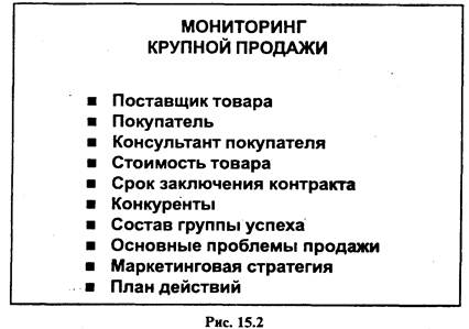 Если мониторинг осуществляется в крупной корпорации, то данная позиция должна содержать сведения о фирме-поставщике товара, входящей в данную корпорацию, и ее руководителе. Если слежение осуществляется в небольшой фирме, то эта позиция может быть персонифицирована до менеджера, осуществляющего выпуск данного товара. Персонифицированная позиция, обозначающая, кто является покупателем вашего товара: какая фирма и кто ее руководитель. Поскольку при крупных продажах клиенты часто прибегают к помощи консультантов, необходимо отслеживать их отношение к вашей продукции. Примерами консультантов являются проектные институты, выполняющие технико-экономические обоснования для приобретения сложных технических товаров: научно-исследовательские институты, обосновывающие необходимость закупки наукоемкого оборудования; консалтинговые и рекламные агентства, осуществляющие продвижение того или иного товара на рынок. Размер стоимости продаваемого товара позволяет ранжировать все проекты персональных продаж по значимости с точки зрения покрытия предпринимательских издержек. Наличие конкретной даты заключения контракта позволяет четко регламентировать процесс продажи и планировать расписание конкретных действий. Если заключение контракта о покупке происходит по результатам торгов (тендера), то дата проведения торгов является основным контрольным сроком. Поскольку сроки принятия окончательного решения о покупке могут постоянно отодвигаться, то постоянный мониторинг данной позиции крайне необходим.