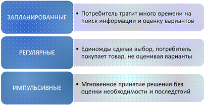 1. Запланированные. К первой группе относятся те, которые представляют для покупателя особую значимость либо с точки зрения их воздействия на жизненные условия (молочная смесь для новорожденного), либо по уровню нагрузки на финансовые ресурсы покупателя (автомобили, дорогая техника), либо в части его взаимоотношений с другими людьми (подарки любимым). Общая характеристика поведения покупателя в части запланированных покупок первого рода (назовем их значимыми) — осуществление полного цикла информационного поиска и предпокупочной оценки вариантов перед покупкой. Следовательно, фирмы, торгующие такого рода товарами и предоставляющие такие услуги, должны с особым вниманием относиться к допокупочным стадиям процесса принятия решения и глубже проникать в процессы поиска информации или процедуры предпокупочной оценки при покупке. 2. Плановые, регулярные. Поведение покупателя при плановых покупках второго рода (назовем их регулярными) должно подразумевать его лояльность по отношению к выбираемым маркам, фирмам-производителям, предпочитаемым странам. С другой стороны, особое значение здесь имеет эффективная логистика: интересные исследования, проведенные в США, показали, что в значительном числе случаев, не находя любимой марки определенного продукта, потребитель склонен заменять его другими. В этом случае фирма с неэффективной логистикой дает возможность своему потребителю произвести пробные покупки других марок, и это может быть началом утраты приверженности. С позиции экономики понятно, что эффективная работа с регулярными плановыми покупками заставляет тратить значительные объемы оборотных средств на обеспечение постоянного присутствия марки в торговых залах. 3. Импульсивные. Незапланированные, или импульсивные, покупки по разным экспертным оценкам составляют 40-70% покупок продовольственных товаров в США, и, соответственно, здесь возникает исключительно важный вопрос о целостности процесса принятия решения. На первый взгляд, покупатель участвует только в одной стадии этого процесса, а именно покупке. Между тем более глубокое изучение вопроса психологами показало, что на самом деле даже и в этом случае имеет место полная структура процесса, но предельно сжатая во времени. Чаще всего это сладости, презервативы, сигареты, спиртное, недорогие товары для дома, бытовую химию, свечи, салфетки, скатерти и так далее. Совершение импульсивной покупки - процесс явного доминирования желания над разумом, мгновенное принятие решения о покупке без осмысления сильных и слабых сторон товара. Большинство импульсивных покупок совершается: