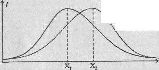 Рис. 2. Возможные соотношения рядов значений в двух выборках: *S1 - зона значений 1-го ряда, которые выше максимального значения 2-го ряда; *S2 - зона значений второго ряда, которые меньше минимального значения 1-го ряда; *штриховкой отмечены перекрещивающиеся зоны двух рядов 1. Вкаждой из сопоставляемых выборок должно быть не менее 11 наблюдений. При этом объемы выборок должны примерно совпадать. Е.В. Гублером указываются следующие правила: а) если в обеих выборках меньше 50 наблюдений, то абсолютная величина разности между n1 и n2 не должна быть больше 10 наблюдений; б) если в каждой из выборок больше 51 наблюдения, но меньше 100, то абсолютная величина разности между n1 и n2 не должна быть больше 20 наблюдений; в) если в каждой из выборок больше 100 наблюдений, то допускается, чтобы одна из выборок была больше другой не более чем в 1,5-2 раза. 2. Диапазоны разброса значений в двух выборках должны не совпадать между собой, в противном случае применение критерия бессмысленно. Между тем, возможны случаи, когда диапазоны разброса значений совпадают, но, вследствие разносторонней асимметрии двух распределений, различия в средних величинах признаков существенны (Рис.3, 4).