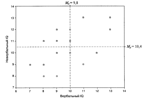 Связь между этими переменными можно изобразить при помощи диаграммы рассеивания (см. рис. 3). Диаграмма показывает, что существует некоторая взаимосвязь измеренных показателей: чем больше значения вербального интеллекта, тем (преимущественно) больше значения невербального интеллекта. Прежде чем дать формулу коэффициента корреляции, попробуем проследить логику ее возникновения, используя данные примера 6.1. Положение каждой /-точки (испытуемого с номером i) на диаграмме рассеивания относительно остальных точек (рис.3) может быть задано величинами и знаками отклонений соответствующих значений переменных от своих средних величин: (Xj— Мх) и (yj — My). Если знаки этих отклонений совпадают, то это свидетельствует в пользу положительной взаимосвязи (большие значения по у или меньшим значениям по х соответствуют меньшие значения по у).