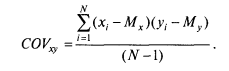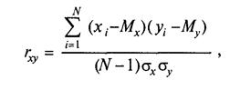 При прямо пропорциональной связи между переменными эта величина является большой и положительной — для большинства испытуемых отклонения совпадают по знаку (большим значениям одной переменной соответствуют большие значения другой переменной и наоборот). Если же х и у имеют обратную связь, то для большинства испытуемых большим значениям одной переменной будут соответствовать меньшие значения другой переменной, т. е. знаки произведений будут отрицательными, а сумма произведений в целом будет тоже большой по абсолютной величине, но отрицательной по знаку. Если систематической связи между переменными не будет наблюдаться, то положительные слагаемые (произведения отклонений) уравновесятся отрицательными слагаемыми, и сумма всех произведений отклонений будет близка к нулю. Чтобы сумма произведений не зависела от объема выборки, достаточно ее усреднить. Но мера взаимосвязи нас интересует не как генеральный параметр, а как вычисляемая его оценка — статистика. Поэтому, как и для формулы дисперсии, в этом случае поступим так же, делим сумму произведений отклонений не на N, а на N— 1. Получается мера связи, широко применяемая в физике и технических науках, которая называется ковариацией (Covariance):