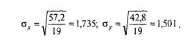 На первом шаге подсчитываются суммы всех значений одного, затем — другого признака для вычисления соответствующих средних значений Мх и Му: Мх = 9,8; Му= 10,4. Далее для каждого испытуемого вычисляются отклонения от среднего: для Х идля Y. Каждое отклонение от среднего возводится в квадрат. В последнем столбике записывается результат перемножения двух отклонений от среднего для каждого испытуемого. Суммы отклонений от среднего для каждой переменной должны быть равны нулю (с точностью до погрешности вычислений). Сумма квадратов отклонений необходима для вычисления стандартных отклонений по известной формуле