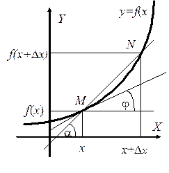 Рассмотрим функцию y=f (x), непрерывную в некоторой окрестности точки x. Пусть D x - приращение аргумента в точке x. Обозначим через Dy или D f приращение функции, равное f (x +D x) – f (x). Отметим здесь, что функция непрерывна в точке x, если в этой точке бесконечно малому приращению аргумента D x соответствует бесконечно малое приращение функции D f. Отношение D f /D x, как видно из рисунка, равно тангенсу угла a, который составляет секущая MN кривой y = f (x) c положительным направлением горизонтальной оси координат. Представим себе процесс, в котором величина D x, неограниченно уменьшаясь, стремится к нулю. При этом точка N будет двигаться вдоль кривой y = f (x), приближаясь к точке M, а секущая MN будет вращаться около точки M так, что при очень малых величинах D x её угол наклона a будет сколь угодно близок к углу j наклона касательной к кривой в точке x. Следует отметить, что все сказанное относится к случаю, когда график функции y = f (x) не имеет излома или разрыва в точке x, то есть в этой точке можно провести касательную к графику функции. Отношение D y / D x или, что то же самое (f (x + D x) - f (x)) / D x, можно рассматривать при заданном x как функцию аргумента D x. Эта функция не определена в точке D x = 0. Однако её предел в этой точке может существовать. Если существует предел отношения (f (x + D x) – f (x)) / D x в точке D x = 0, то он называется производной функции y = f (x) в точке x и обозначается y¢ или f¢ (x):