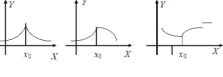 Нахождение производной функции y = f(x) называется дифференцированием. Если для любого числа x из открытого промежутка (a, b) можно вычислить f¢(x), то функция f(x) называется дифференцируемой на промежутке (a, b). Геометрический смысл производной заключается в том, что производная функции f(x) в точке x равна тангенсу угла наклона касательной к графику функции в этой точке. Производная - это скорость изменения функции в точке x. Из определения производной следует, что f¢ (x)» D f / D x, причем точность этого приближенного равенства тем выше, чем меньше D x. Производная f¢ (x) является приближенным коэффициентом пропорциональности между D f и D x. Производная функции f (x) не существует в тех точках, в которых функция не является непрерывной. В то же время функция может быть непрерывной в точке x 0, но не иметь в этой точке производной. Такую точку назовём угловой точкой графика функции или точкой излома. Графические примеры приведены на рисунках: