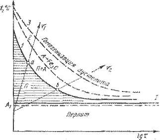 Превращение основано на диффузии углерода, сопровождается полиморфным превращением Feα → Feγ, а так же растворением цементита в аустените. Для исследования процессов строят диаграммы изотермического образования аустенита (рис. 12.1). Для этого образцы нагревают до температуры выше A1 и выдерживают, фиксируя начало и конец превращения.