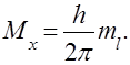 Орбітальне квантове число може набувати додатних цілочислових значень від 0 до n – 1. Кожному значенню l відповідає певний електрон-ний підрівень в атомі. Енергетичні підрівні позначаються маленькими ла-тинськими літерами: Орбітальне квантове число 0 1 2 3 Енергетичний підрівень s p d f Можлива кількість підрівнів для кожного енергетичного рівня дорів-нює номерові цього рівня, тобто величині його головного квантового числа. Так, якщо n = 1 l = 0 підрівень 1s n = 2 l = 0; 1 підрівні 2s 2p n = 3 l = 0; 1; 2 підрівні 3s 3p 3d n = 4 l = 0; 1; 2; 3 підрівні 4s 4p 4d 4f Відповідно до квантово-механічних розрахунків s-орбіталі мають форму кулі (сферична симетрія) p-орбіталі форму гантелі d- та f-орбіталі складніші форми. Магнітне квантове число ml – характеризує просторове розташу-вання електронних орбіталей відносно спрямованості магнітного поля. Магнітне поле орієнтує площину орбіталі у просторі під певними кутами, при яких проекція орбітального моменту Мх на спрямованість поля (на-приклад на вісь абсцис) визначається за формулою: