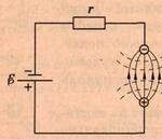 Рис.2 Таким образом, на диполь в однородном электрическом поле действует момент силы, зависящий от электрического момента ориентации диполя, а также напряженности поля. Дипольный электрический генератор (токовый диполь) В вакууме или в идеальном изоляторе электрический диполь может сохраняться сколь угодно долго. Однако в реальной ситуации (электропроводящая среда) под действием электрического поля диполя возникает движение свободных зарядов и диполь либо экранируется, либо нейтрализуется. Можно к диполю подключить источник напряжения, иными словами, клеммы источника напряжения представить как диполь. В этом случае, несмотря на наличие тока в проводящей среде, диполь будет сохраняться (рис.3). Резистор R1 является эквивалентом сопротивления проводящей среды, Е — ЭДС источника, r — его внутреннее сопротивление (рис.4).
