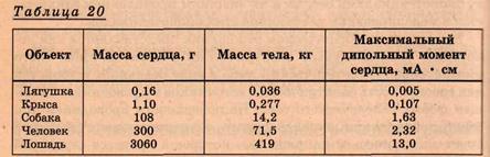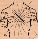 Рис.5 Дипольное представление о сердце лежит в основе теории отведений Эйнтховена. Согласно ей, сердце есть диполь с дипольным моментом р с1, который поворачивается, изменяет свое положение и точку приложения (изменением точки приложения этого вектора часто пренебрегают) за время сердечного цикла. На рис. 5 показаны положения вектора р си эквипотенциальных линий для момента времени, когда дипольный момент максимален; это соответствует «зубцу» R на электрокардиограмме (см. рис.). В табл. 2 приведены значения максимального дипольного момента сердца для человека и некоторых животных, они сопоставляются с массами сердца и тела.