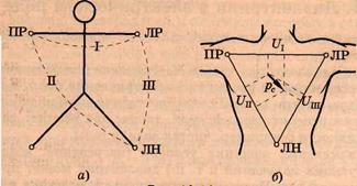 В. Эйнтховен предложил снимать разности биопотенциалов сердца между вершинами равностороннего треугольника, которые приближенно расположены в правой руке (ПР), левой руке (ЛР) и левой ноге (ЛН) (рис.6, а). На рис. 6, б схематически изображен этот треугольник. По терминологии физиологов, разность биопотенциалов, регистрируемая между двумя точками тела, называют отведением. Различают I отведение (правая рука — левая рука), II отведение (правая рука — левая нога) и III отведение (левая рука — левая нога), соответствующие разностям потенциалов Ui Uii и Uiii. По Эйнтховену, сердце расположено в центре треугольника. Отведения позволяют определить по формуле соотношение между проекциями электрического момента сердца на стороны треугольника.