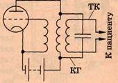 И их возможные использования Усилители и генераторы Усилителями электрических сигналов (электронными усилителями) называют устройства, увеличивающие эти сигналы за счет энергии постороннего источника. Генераторами (электронными генераторами) называют устройства, которые преобразуют энергию источников постоянного напряжения в энергию электромагнитных колебаний различной формы. Рассматриваются некоторые общие вопросы этихустройств и специфика их применения в медицине. Как практически важный прибор, включающий в себя и усилитель и генератор, рассматривается электронный осциллограф. Высокочастотная физиотерапевтическая электронная аппаратура. Аппараты электрохирургии Большая группа медицинских аппаратов — генераторов электромагнитных колебаний и волн — работает в диапазоне ультразвуковых (надтональных), высоких, ультравысоких и сверхвысоких частот и называется обобщающим термином высокочастотная электронная аппаратура. Проблема электродов в данном случае решается по-разному. Для высокочастотных токов используются стеклянные электроды, воздействие переменным магнитным полем (индукто-термия) оказывается через спирали или плоские свернутые кабели, по которым проходит переменный ток, создавая переменное магнитное поле. При УВЧ-терапии прогреваемую часть тела помещают между дискообразными металлическими электродами (рис. 18.13), покрытыми слоем изолятора. При воздействии электромагнитными волнами приближают к телу излучатель этих волн. Для безопасности больного электроды подключаются не к колебательному контуру генератора (КГ), а к контуру пациента (терапевтическому контуру, ТК), который индуктивно связан с основным колебательным контуром генератора (рис. 18.14). Индуктивная связь исключает возможность случайного попадания больного под высокое постоянное напряжение, которое практически имеется в большинстве медицинских высокочастотных генераторов. На рис. 18.14 изображен генератор на триоде, так как ламповые генераторы еще применяются в медицинской аппаратуре в связи с необходимостью получить достаточно большую мощность.