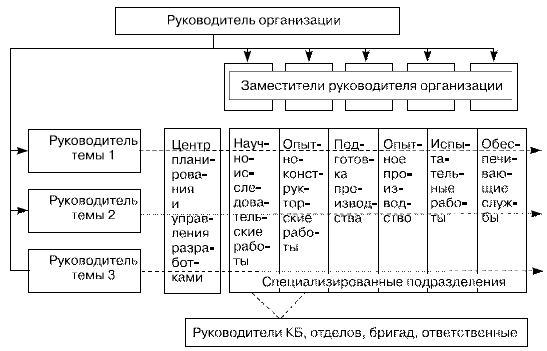 Выше приведенные структуры относятся к иерархическим ОСУ (бюрократические, традиционные), которые характеризуются жесткой иерархией власти, формализацией используемых правил и процедур, централизованным принятие решений. Другой вид ОСУ – адаптивные (органические, гибкие), им свойственны размытость иерархии управления, небольшое число уровней управления, гибкость структуры власти, слабое или умеренное использование формальных правил и процедур, децентрализация принятия решений, индивидуальная ответственность каждого работника за общие результаты деятельности. 5. Одной из разновидностей адаптивных структур является матричная ОСУ.
