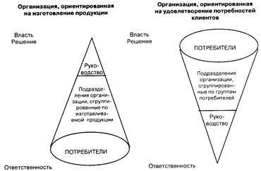 Рис. 4.5. Взаимосвязь между стратегией и организационным дизайном Вторая область стратегического выбора имеет отношение к тому, какие потребители будут обслуживаться организацией. Если у организации имеются индивидуальные и «организованные» потребители, то эта двойственность должна найти отражение при ее проектировании во всех элементах. Так, предприятие, производящее машины и оборудование и товары народного потребления одновременно не может сужать свою структуру только до обслуживания промышленных потребителей. Игнорирование данного факта в условиях российской действительности большинством оборонных и машиностроительных предприятий нередко делает их противниками проведения конверсии. Переход организации от стратегии, ориентированной на изготовление продукции, к стратегии, ориентированной на удовлетворение потребностей клиентов, требует от нее радикального перепроектирования и изменения основ своей деятельности. Структурная и властная схемы такой организации, образно говоря, должны быть перевернуты «с ног на голову» (рис. 4.6). Третье в стратегическом выборе — это рынки сбыта и территориальное размещение производства. Выход компании с целью размещения производства или продажи продукции за рамки национальных границ потребует учета при проектировании ее организационной системы, учета фактора интернационализации и глобализации в бизнесе. Естественно, это сделает структуру организации более громоздкой и сложной, о чем свидетельствует опыт многонациональных и транснациональных корпораций. Однако это возникающее в данном случае дублирование структурных подразделений на разных уровнях и усложнение связей между последними является необходимым, если организация хочет сохранить себя как единое целое на международной арене.