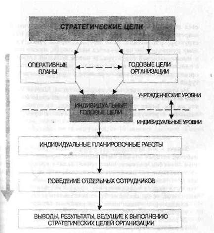 Рис. 2.6. Этапы процесса управления по целям - МВО долгосрочных и краткосрочных целей для организации и для себя лично, эти цели формируются для работников следующего уровня в нисходящем порядке по цепи команд. Когда осуществляется процесс выработки целей, необходим двусторонний процесс информацией, чтобы обеспечить понимание каждым исполнителем его конкретных целей. Планирование действий. Вторым этапом процесса МВО является планирование действий. Согласно Антони Райа: «В то время, как набор задач отражает «конечные цели» управленческой деятельности, хорошо разработанные планы обеспечивают «средства» их достижения. Планирование действий связано с определением того, что, кто, когда и где и в каком количестве требуется для достижения данной цели. Это - практический способ создания связующего звена между постановкой цели и более полной программой реализации». Проверка и оценка. Этан проверки и оценки наступает после истечения установленного периода времени. Его задачей является определение степени достижения целей, выявление проблем и помех, определение причин этих помех, выявление потребностей и вознаграждения за эффективную работу. корректирующие меры. Четвертый этап процесса МВО -принятие корректирующих мер - соответствует последнему этапу процесса контроля. Управление по целям имеет множество сторонников, и известны примеры положительных результатов применения данного метода. Общая правильность метода МВО обосновывается исследованиями в области установления целей и обратной связи. Однако у метода МВО много критиков, и имеются случаи, когда программы МВО потерпели неудачу. Одна из причин неудач - слишком большое внимание к участию работников в постановке своих целей. Общая и более существенная проблема состоит в том, что руководству часто не удается использовать все аспекты МВО: ПРИЧИНЫ НЕУДАЧИ ПРОГРАММ МВО* 1. Отсутствие заинтересованности и поддержки высшего руководства. Для успеха программам МВО необходима полная поддержка высшего руководства, 2. Искажение концепции. Программам МВО обычно оказывают сопротивление, если они используются в качестве «кнута» для усиления контроля над подчиненными. 3. Трудности при постановке целей. Некоторые виды работ и областей деятельности трудно объективно оценить и количественно определить. 4. Увеличение канцелярской работы. Руководители могут оказывать сопротивление реализации программы, потому что это увеличивает объем их канцелярской работы. 5. Ужесточение дефицита времени. Чтобы использовать программу МВО, руководитель должен учиться устанавливать приоритеты и эффективно использовать время. 6. Отсутствие соответствующей квалификации. У руководителей может отсутствовать необходимая квалификация для определения целей, планирования, обмена информацией и межличностных взаимодействий, таких как обучение, консультация, а также передача и получение информации на основе обратной связи. 7. Отсутствие индивидуальной мотивации. Вознаграждения в явной и скрытой форме (например, премия и моральное удовлетворение) должны быть достаточными для стимулирования людей к работе. 8. Слабая интеграция с другими системами. Этапы постановки целей и проверки результатов должны сочетаться с другими мерами, например, прогнозированием, составлением бюджета и иными процессами. 9.