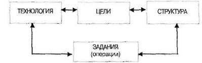 Рис. 1.8. Взаимосвязь должностей, структуры и целей [10] народов», вышедшей в 1776 году, приводит пример: один человек в день делает одну булавку, а если разбить процесс изготовления булавки на 18 операций, то 10 человек сделают за один день 48 тысяч булавок, т.е. 4800 булавок на человека. 1.3.4. Технология Технология - это средство преобразования ресурсов в продукты или услуги. Задачи и технология тесно связаны между собой (рис. 1.9). Выполнение задачи включает в себя использование конкретной технологии как средства преобразования материалов (вход) в продукты (выход). В технологию входят и оборудование, и инфраструктура, и инструменты, и сам способ преобразования сырья в продукцию. Влияние технологии | на управление в значительной степени определяется стандартизацией, механизацией и применением конвейерных линий. Стандартизация - это использование стандартных взаимосвязанных компонентов в производстве. Впервые применил стандартизацию изобретатель хлопкоочистительных машин (совершивших переворот в хлопкообработке) Эли Уитни (1765-1825 гг.), который после многолетней безуспешной борьбы с владельцами хлопковых плантаций (использовавших бесплатно его изобретение, нарушая авторские права) занялся производством дешевых и ремонтно-пригодных в полевых условиях (благодаря взаимозаменяемости узлов) мушкетов. Дальнейшее развитие стандартизации осуществил Генри Форд при Производстве массовых дешевых автомобилей. Он продавал автомобили по 295 долларов и платил рабочим по 5 долларов I день, тогда как другие фирмы продавали автомобили по 2000 долларов и платили своим рабочим по 3 доллара в день. Это дало мощный толчок углублению специализации и разделению труда и на этой основе - массовому производству.