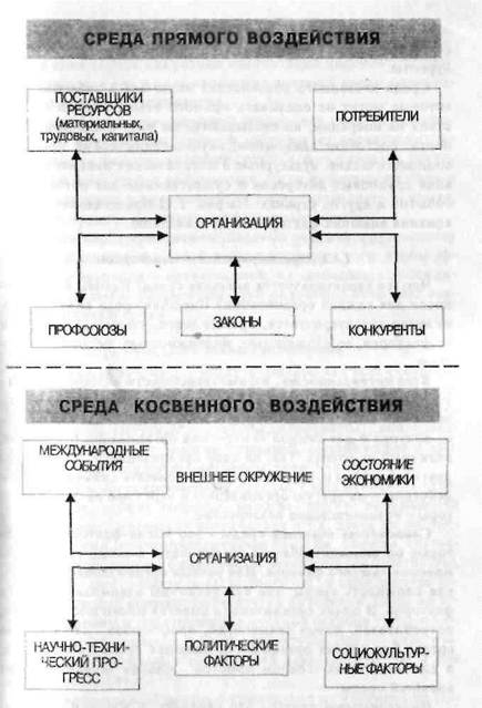 Рис. 1.10. Взаимозависимость внутренних элементов организации действий организаций, так как на нем показаны только внутренние переменные. Внешние переменные мы рассмотрим ниже. 1.4. Внешняя среда организации 1. 4.1. Организация и ее внешняя среда До последнего времени наука управления рассматривала только внутреннюю среду организации, не обращая внимания на ее внешнюю среду. Сегодня это считается крупным недостатком любого подхода. Как мы увидим ниже, современным организациям приходится приспосабливаться к изменениям во внешнем окружении и соответственным образом осуществлять изменения внутри себя. Внешнее окружение организации все больше становится источником проблем для ее руководства. Организация как открытая система зависит от внешнего мира в отношении поставок ресурсов, энергии, кадров, потребителей. Так как от руководства зависит выживание организации, то руководитель должен уметь выявлять существенные факторы в окружении, которые повлияют на его организацию, и предложить подходящие способы реагирования на внешние воздействия. Организации должны приспосабливаться к внешней среде, чтобы выжить. Так что же относится к внешней среде? Из чего она состоит? Факторов внешней среды слишком много, всего не учесть. Надо выбрать главное. Руководитель должен выбрать, ограничить учет внешнего окружения только теми факторами, от которых решающим образом зависит успех организации. К основным элементам внешней среды можно отнести: потребителей, конкурентов, правительственные учреждения, законодательные акты, поставщиков, финансовые организации и источники трудовых ресурсов. Все внешние факторы можно разделить на две основные группы: а) силы прямого воздействия на организацию; б) силы косвенного воздействия (рис. 1.11). Среда прямого воздействия включает в себя факторы, которые непосредственно влияют на операции организации и испытывают на себе прямое влияние операций организации. К