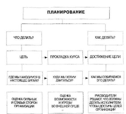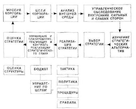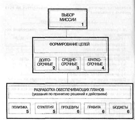 Рис. 2.3. Схема процесса планирования обходимое для них качество как ориентация на будущее. Они должны уметь смотреть дальше своих привычных повседневных проблем, чтобы прогнозировать все те проблемы, которые перед ними могут возникнуть в будущем. Менеджеры, концентрирующие внимание исключительно на непосредственных, повседневных проблемах и игнорирующие будущее, неизбежно обречены на неудачу. Виды планов в соответствии с длительностью планового периода бывают: краткосрочные (до 12 месяцев), среднесрочные (от 1 до 5 лет) и долгосрочные (5 лет и более). Руководители высшего звена занимаются в основном долгосрочным и среднесрочным (стратегическим) планированием. Стратегический план - это комплексный план по обеспечению главных целей организации. Он разрабатывается и фор-