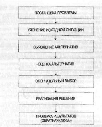 3.1.1. Основные подходы к принятию решении Руководителем можно назвать человека только тогда, когда он принимает управленческие решения и реализует их через других людей. Эффективные решения - залог существования каждого предприятия. Способность принимать решения развивается с опытом. Решение - это акт выработки окончательного суждения. Применительно к управлению - это выбор определенного курса действий из возможных альтернатив. Поскольку мы говорим о работе менеджера в организации, то, естественно, дадим понятие организационному решению. Организационное решение - это выбор, который должен сделать руководитель, чтобы выполнить обязанности, обусловленные занимаемой им должностью. Цель организационного решения - эффективно справиться с проблемой, возникшей на пути достижения целей организации. Поскольку решений без отрицательных последствий для каких-либо частей организации не бывает, приходится принимать не оптимальные, а компромиссные решения с учетом этих последствий. Процесс принятия решений может быть основан на интуиции, суждениях, рациональных методах. Интуитивное решение - это выбор, сделанный на основе ощущения того, что он правилен. При этом не взвешиваются все «за» и «против» по каждой альтернативе и не стремятся вникнуть в ситуацию. Просто делается выбор с помощью озарения (шестого чувства). Особенно часто такие решения принимают руководители высшего уровня, так как стоящие перед ними проблемы столь сложны, что невозможно все рассчитать. Решение, основанное на суждениях, - это выбор, обусловленный знаниями или накопленным опытом (используются сходные ситуации в прошлом). Оно сходно с интуитивным, так как логика его не очевидна. Оно опирается на здравый смысл. Суждение как основа организационного решения полезно, поскольку многие ситуации в организациях имеют тенденцию к частому повторению, и ранее принятое решение может сработать не хуже, чем прежде. Достоинства таких решений - в бы- строте и дешевизне их принятия. В новых или очень сложных ситуациях одного здравого смысла маловато. Здесь можно упустить новую, более эффективную альтернативу. Руководитель, придерживающийся только своего опыта, может быть противником всего нового. Рациональное решение - это решение, обоснованное с помощью объективного аналитического процесса. Остановимся на нем подробнее. 3.1.2. Рациональное решение Мы уже говорили, что решение - это выбор определенного курса действий из возможных альтернатив. Часто некачественные решения принимаются из-за неправильно поставленной проблемы, неясности ситуации и непродуманности последствий решения. Отсюда в процесс подготовки и принятия решений можно включить следующие семь этапов: постановка проблемы, уяснение исходной ситуации, выявление альтернатив, оценка альтернатив и их возможных последствий, выбор лучшей альтернативы, реализация решения, проверка результатов. Рассмотрим эти этапы (рис. 3.2). Постановка проблемы. Часто плохие решения принимаются потому, что принявший их руководитель не понимал существа проблемы. Он за проблему принимал ее внешнее проявление - симптом и пытался лечить этот симптом, а не причину, т.е. саму проблему. Следовательно, надо прежде всего выявить саму проблему, отделить ее от симптомов. Это не всегда бывает легко. Выявление настоящей проблемы требует навы
