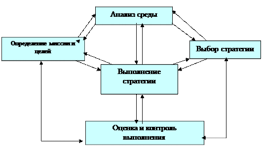 Стратегическое планирование. Стратегическое планирование – это выбор целей организации и путей их достижения. Стратегическое планирование является основой для всех управленческих решений. Задачей стратегического планирования является обеспечение нововведений и изменений в организации для достижения стратегических целей. В системе долгосрочного планирования цели претворяются в программы действий, бюджеты, планы прибылей, разрабатываемые для каждого из главных подразделений организации. Стратегическое управление можно рассматривать как совокупность пяти взаимосвязанных управленческих процессов.