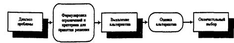 Управленческие решения всегда связаны с необходимостью воздействий на объект управления с целью приведения его в желаемое состояние, и, так как это требует затрат времени, можно с полным основанием говорить о процессе принятия решений. Процесс принятия управленческих решений носит циклический характер, начинается с обнаружения несоответствия параметров плановым заданиям или нормативам и заканчивается принятием и реализацией решений, которые должны это несоответствие ликвидировать. Поэтому основным элементом каждого процесса принятия решений является проблема, под которой понимается несоответствие фактического состояния управляемого объекта (например, производства) желаемому или заданному, т. е. цели или результату деятельности. Выработка плана действий по устранению проблемы составляет сущность процесса принятия решений. Проблемы могут возникать, когда функционирование управляемого объекта не создает необходимых предпосылок для достижения поставленных целей в данный момент или в будущем. Кроме того, источником возникновения проблем могут быть изменившиеся под воздействием тех или иных условий цели деятельности. Таким образом, проблема всегда связана с совокупностью условий или факторов, которые создают ситуацию, оказывающую влияние на деятельность организации. Проблемная ситуация характеризует проблему, возникшую под воздействием сложившейся ситуации. Выявление проблемной ситуации представляет собой исходный момент для постановки задачи принятия решений. Описание проблемной ситуации, как правило, содержит две части: характеристику самой проблемы (места и времени ее возникновения, сущности и содержания, границ распространения ее воздействия на работу организации или ее частей) и ситуационные факторы, приведшие к появлению проблемы (они могут быть внешними и внутренними по отношению к организации). Это дает возможность оценить значение проблемы, наметить временные рамки ее решения и принять за основу ту или иную структуру процесса принятия решений. Если проблема несложна, а ситуационные факторы ясны и управляемы, процесс принятия решений может быть достаточно прост и скор. В этом случае после уяснения проблемной ситуации принимается решение, которое оказывает не нее прямое воздействие и приводит систему (управляемый объект) в состояние, соответствующее заданному. Например, если произошла поломка станка, на котором планировалось изготовление партии деталей, и известны факторы, приведшие к его выходу из строя (например, высокий износ оборудования), то при наличии в цехе аналогичного станка в исправном состоянии проблемную ситуацию (срыв выполнения плана производства партии деталей из-за неисправности станка) можно разрешить путем замены вышедшего из строя оборудования имеющимся в резерве. Если проблемная ситуация не так очевидна, а ее решение неоднозначно, то процесс принятия решении требует структуризации, которая позволит определить этапы и процедуры, направленные на ее решение. Процесс принятия решений представляет собой последовательную реализацию следующих этапов (рисунок 32): • диагноз проблемы; • формулировка ограничений и критериев для принятия решения; • выявление альтернатив; • оценка альтернатив; • окончательный выбор.