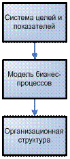 Управлять – значит приводить объект управления в целевое состояние. Исходя из этого определения, можно выделить основные элементы системы управления организацией. Целевое состояние объектов управления задает система целей и показателей, деятельность по приведению объектов управления в нужное состояние описывается с помощью модели бизнес-процессов, исполнители этой деятельности определяются организационной структурой (Рис.1).